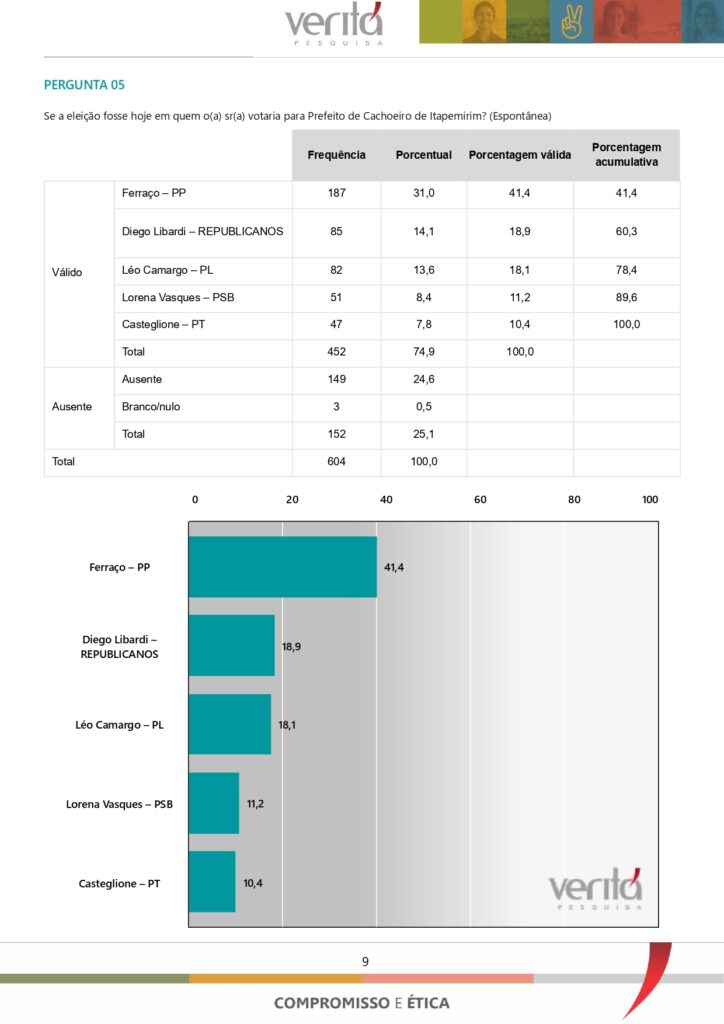 A pesquisa do Instituto Veritá, registrada no TSE sob o número ES-08113/2024, possui uma margem de erro de 4 pontos percentuais para mais ou para menos. Em comparação com a pesquisa anterior realizada entre os dias 19 e 20 de julho de 2024 pelo Instituto Directa Consultoria e Publicidade Ltda, registrada sob o número ES-03796/2024, que apresentava uma margem de erro de 3,62%, Ferraço teve um aumento significativo. Na pesquisa anterior, Ferraço tinha 20,4% das intenções de voto no cenário espontâneo e agora surge com 41,4%.
