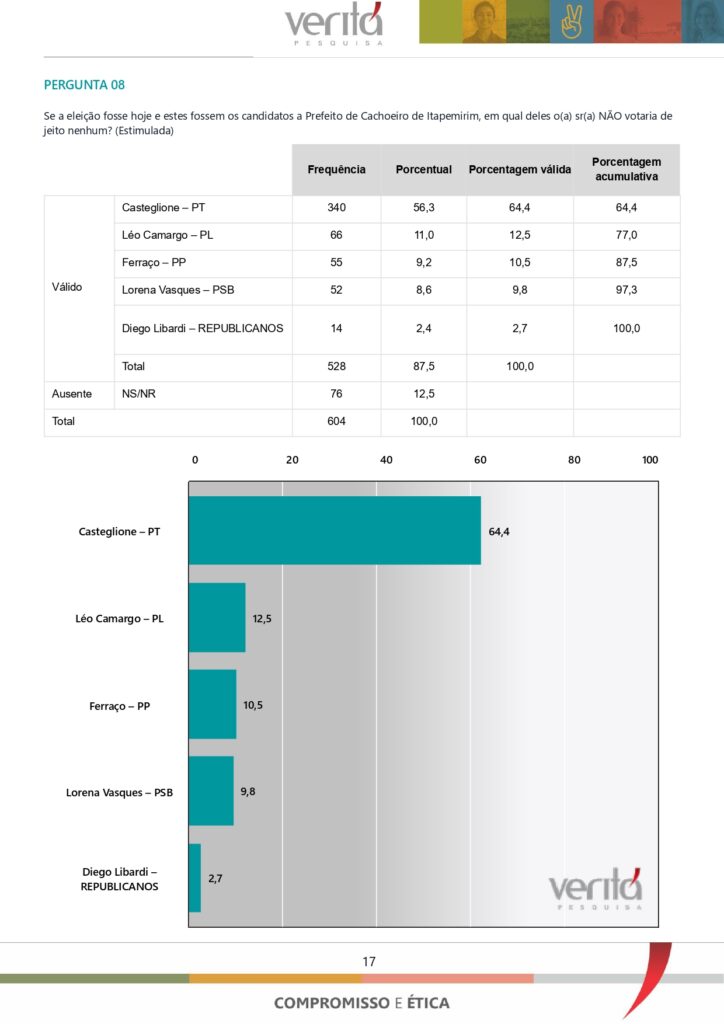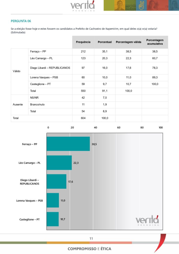 No cenário estimulado, Ferraço mantém a liderança e pode alcançar até 42,5 pontos, considerando a margem de erro. Ferraço é preferido por 38,5% dos eleitores. Em segundo lugar, Léo Camargo, com 22,3%, está tecnicamente à frente de Diego Libardi, que tem 17,6%. Lorena Vasques e Carlos Casteglione seguem empatados com 11% e 10,7%, respectivamente.